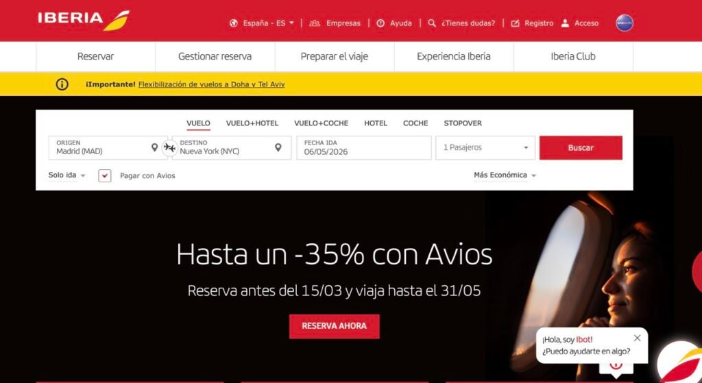 Disfruta de hasta un 35 % de descuento en Avios al reservar tus vuelos en redención en rutas seleccionadas del Grupo Iberia. Esta promoción aplica a vuelos operados por Iberia, Iberia Express e Iberia Regional Air Nostrum. Ten en cuenta que las tasas e impuestos no están incluidos en el descuento.